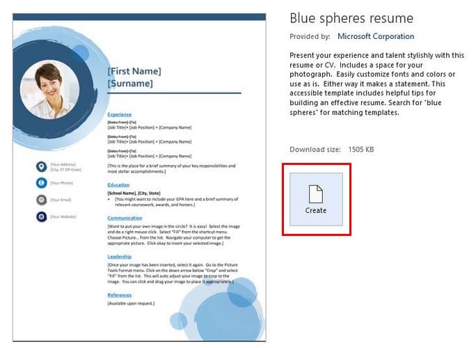 As you can see in the image above, I chose the Blue spheres resume model. Right below the template’s name, Word shows you a brief description of what the template has to offer.
